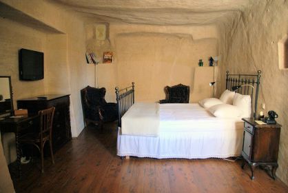 This street-level house has two bedrooms: One has beautiful stone lancet arches of tawny stone; the other is carved right from the rock—a real cave. Both have king beds and all comforts. An extra sofa bed is possible into one of the bedrooms. The cave bathroom is fully modern, with a wide vanity and walk-in shower. When it’s time for sun, sit in the spacious courtyard for coffee, meals or cocktails. The kitchen is fully equipped for cooking meals.